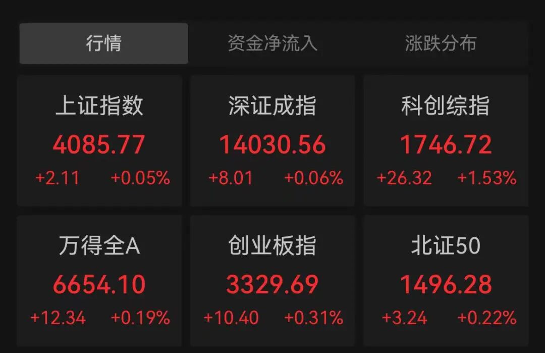 具体来看,沪指盘中震荡上扬,午后一度回落,尾盘再度翻红,连续14日收阳;科创50指数较为强势。截至收盘,沪指微涨0.05%报4085.77点,深证成指涨0.06%,创业板指涨0.31%,科创50指数涨0.99%,沪深北三市合计成交约2.88万亿元,较此前一日增加近500亿元。