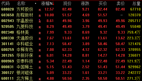 稀土板块盘中强势拉升,截至收盘,方邦股份涨超12%,中科磁业、中稀有色涨超7%,中国稀土涨逾5%。