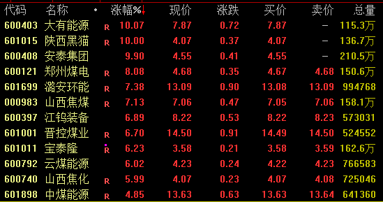 煤炭板块盘中大幅走高,截至收盘,大有能源、陕西黑猫、安泰集团涨停,郑州煤电涨超8%。